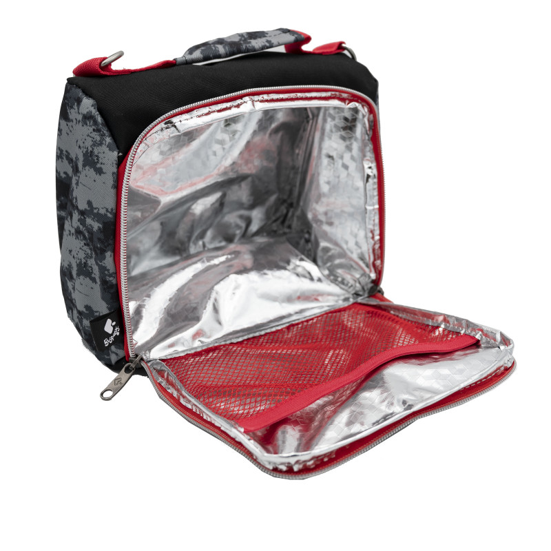 La carmenyola térmica Breakout wolf zone té un compartiment principal amb interior isotèrmic per conservar frescos o calents els aliments i les begudes. Corretja regulable. Material: polièster i recobriment d'alumini. Breakout wolf zone by BUSQUETS presenta un disseny en tons grisos amb efecte de camuflatge digital. La part frontal mostra una gran il·lustració d’un llop dins d’un triangle vermell, amb detalls en vermell intens i el text “wolf zone” repetit a la part inferior.
