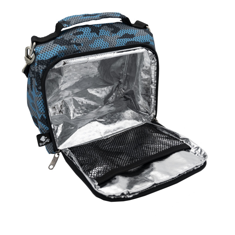 Portameriendas No Limits by BUSQUETS presenta un diseño con estampado de camuflaje en tonos azules, negros y grises. En la parte frontal destaca una ilustración de bosque con el texto “NO LIMITS NO RULES” en letras grandes y con efecto desgastado.