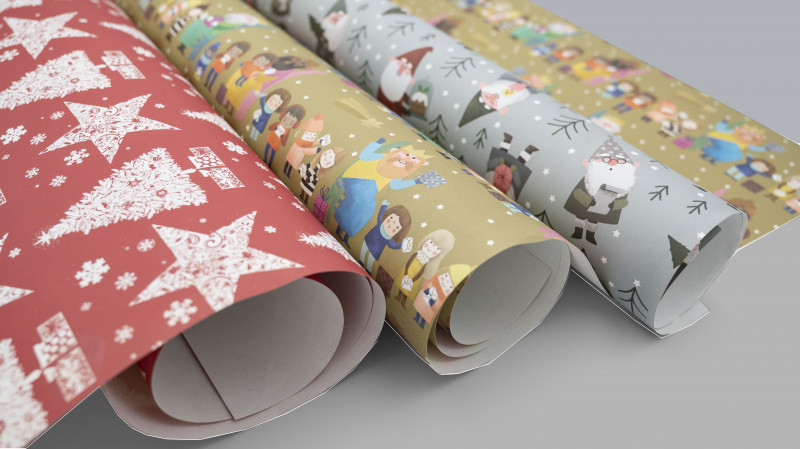 Papel de presente natalino em folhas 100×70 cm, 80 g. Estampas festivas e alta qualidade. Venda apenas na loja.